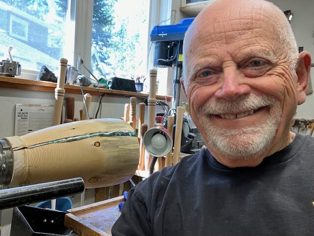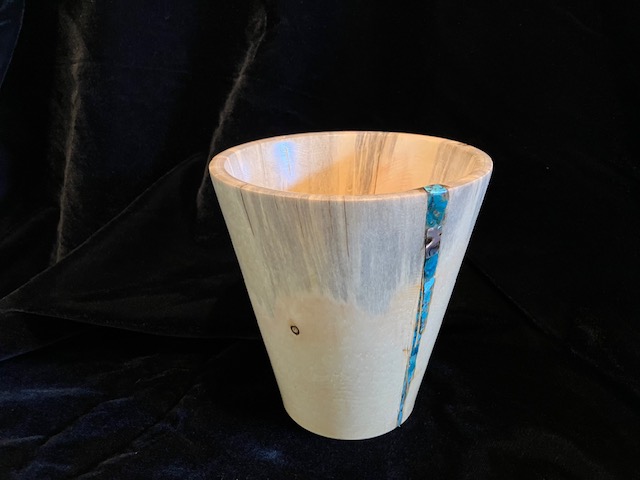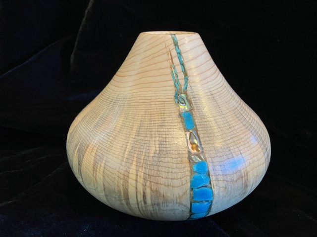 George Epp uses his lathe to turn Colorado’s pine and aspen into beautiful pieces of art. After retiring he went back to an interest in wood turning that began in junior high wood shop classes. He has developed techniques for inlaying turquoise and abalone shell in the cracks and recesses in the wood he finds locally. His forms often evoke the simplicity of Native American potteryand the patterns of inlay are a reminder of Colorado’s streams and lakes.