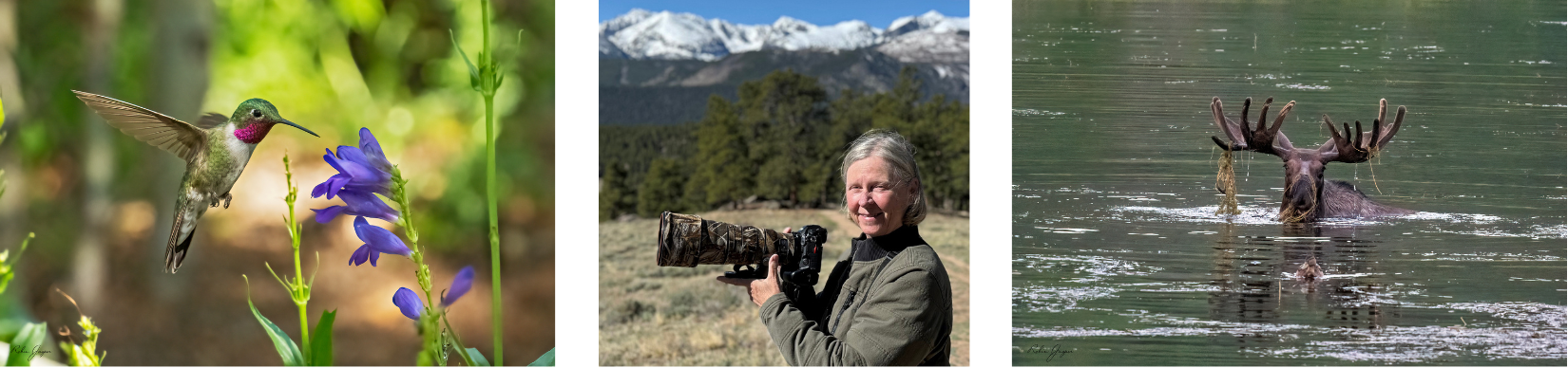 Lyn has observed and photographed natural wonders and wildlife in Africa, Australia, Costa Rica, Peru, the Galápagos Islands, Alaska, Hawaii, Mexico, Canada, National Parks throughout the United States and now Estes Park. Her photography reflects respect and gratitude for the gifts of nature and an ability to pay attention to and appreciate the large and small in nature.