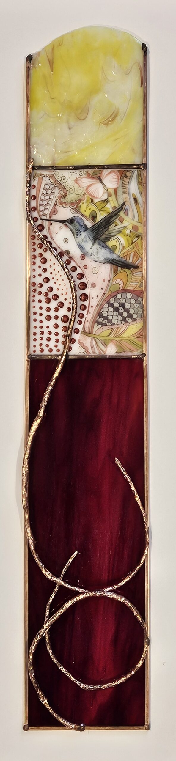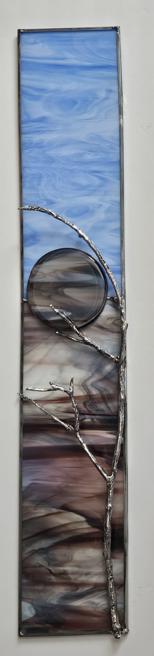 Sally creates stained glass art panels that are original designs embellished with fused glass. Her inspiration comes primarily from the beauty and vastness of nature, but also from the glass itself. Different from traditional stained glass, she utilizes large pieces of glass to take advantage of all the colors and swirls inherent in glass. These characteristics of glass become part of her designs. Many of Sally’s original designs incorporate a tree branch, which are found in the forests and glorious mountain trails of Colorado. Other embellishments are layers and bits of glass fused in her studio kiln. She has been a member of the Littleton Fine Arts Guild since 2011 and a member of The Old Gallery since 2015. Her work has been featured at the Lonetree Art Expo and The Depot Art Gallery in Littleton.