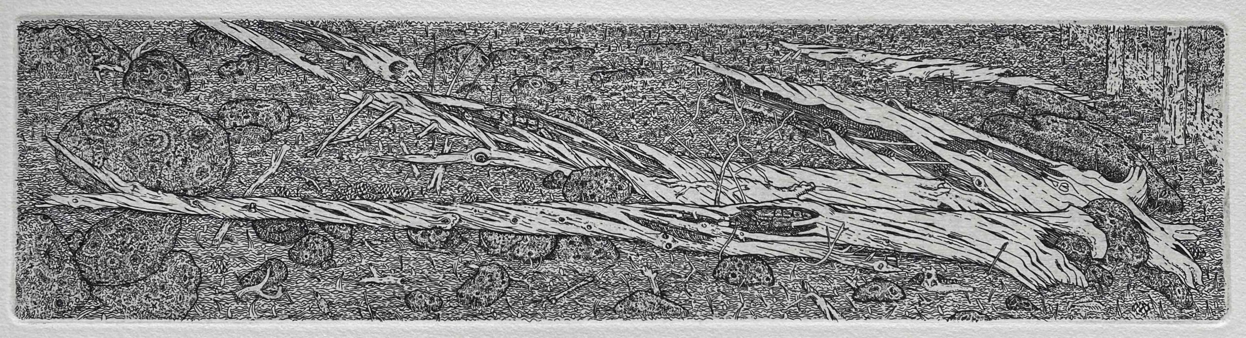 His recent etchings and engravings have focused on the remains of trees observed in or near Rocky Mountain National Park. He does not think of these as stumps or logs since those terms conjure up human intervention with axes and saws. He considers them more as ruins or as horizontal trees, having succumbed to old age, disease, beetle infestations or fire, often revealing their complex biological structure and their interdependence with other life forms.